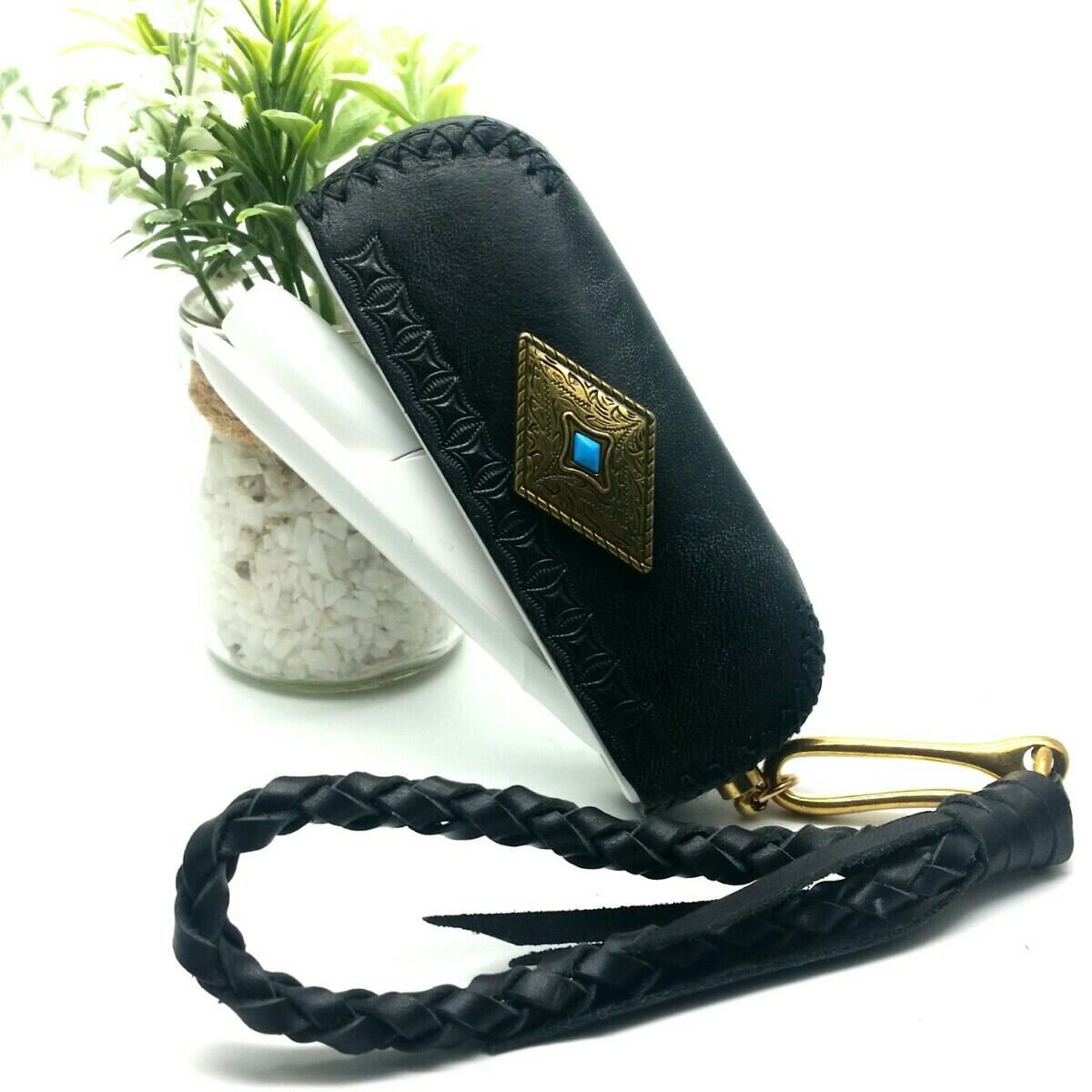 新型 ILUMAイルマ対応 イニシャル刻印無料 ハンドメイド栃木レザー IQOS3ケース アイコス3レザーケース 黒ブラック 三角ターコイズ
