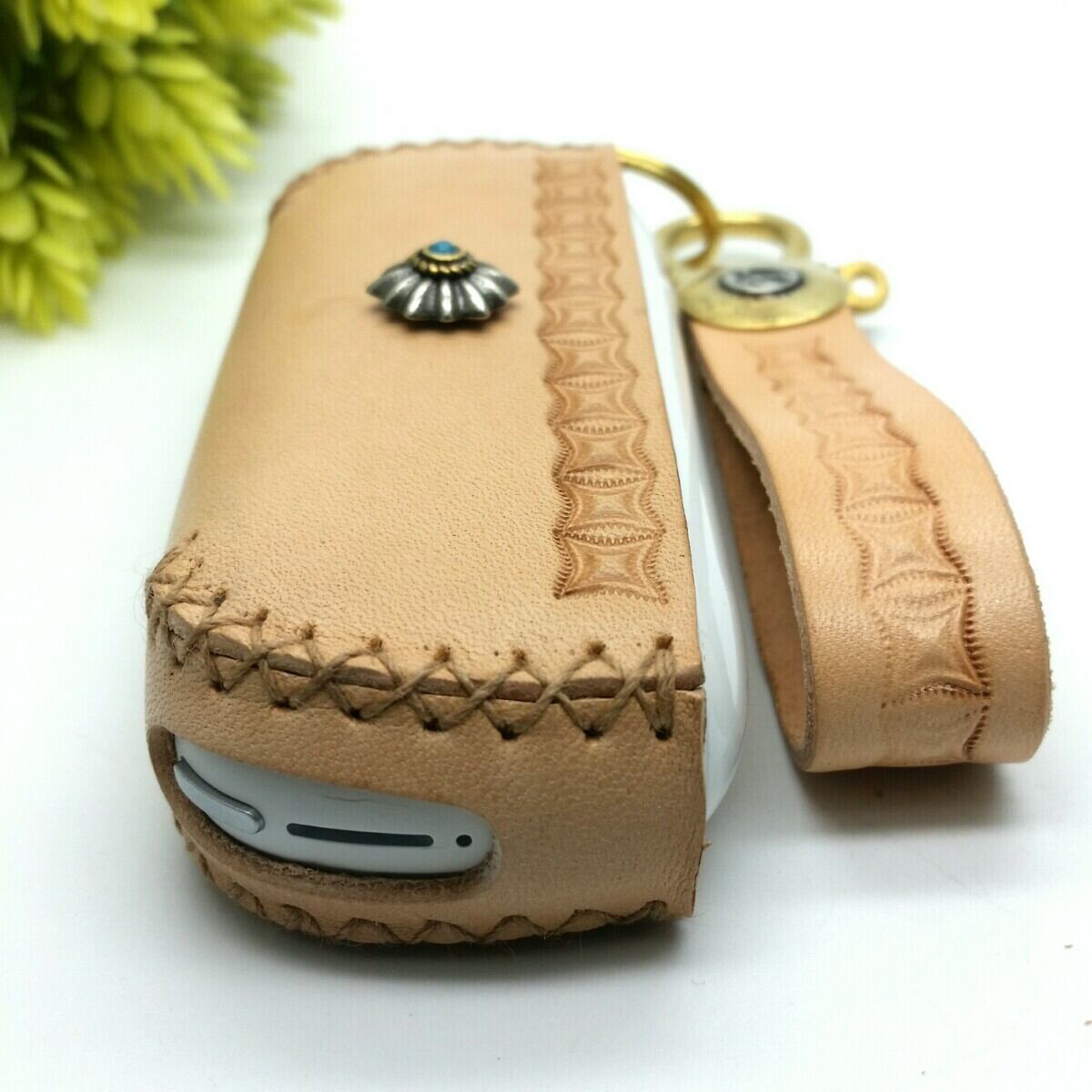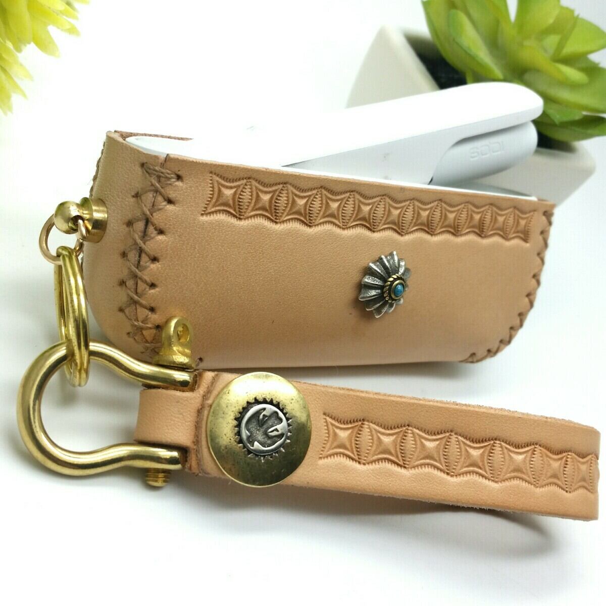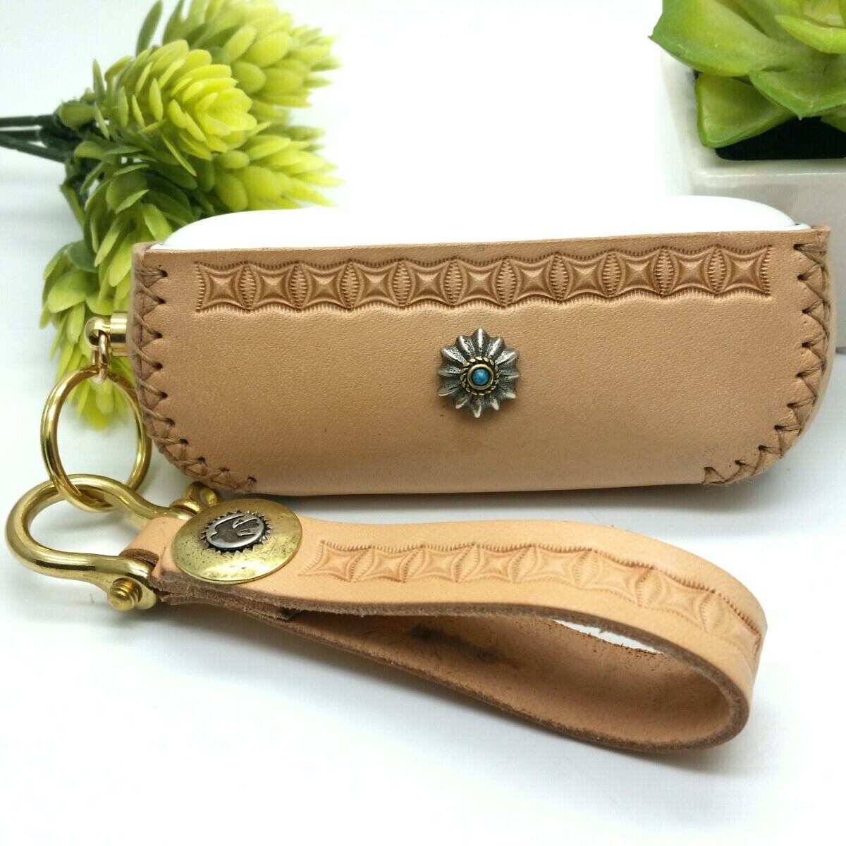栃木レザーのナチュラルカラーとアンティークリリーデザインコンチョにジオメトリーな神秘的刻印は大人の男女に好まれるエッジが効いてるのに品格のあるデザインです!