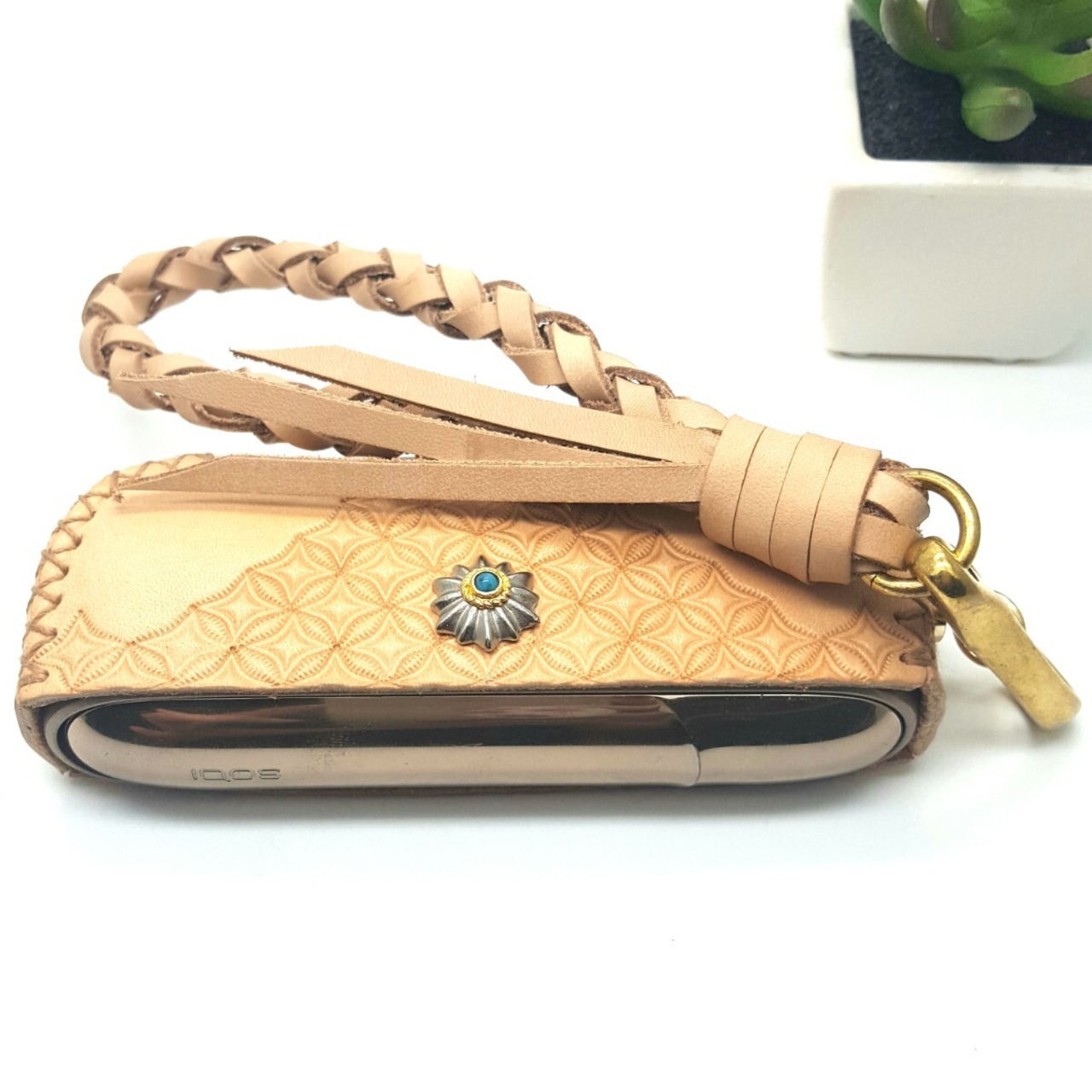 新型 ILUMAイルマ対応 イニシャル刻印無料 ハンドメイド栃木レザー IQOS3ケース アイコス3レザーケース ベージュ ジオメトリー ターコイズ